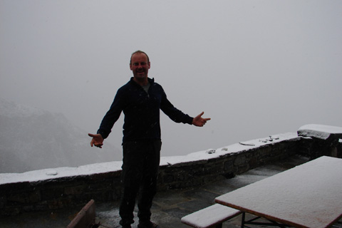 Wolfgang und im Hintergrund das Matterhorn in Wolken.